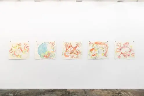 At Manifesta, Györi presented Vibration Highway, an impressive group of “Masturbation Portraits”: large scale works on paper drawn in private sessions with women, who — in “an act of playing together” (Györi) — were invited to pleasure themselves. Corresponding fantasies are documented in equally sized Phantasy Analysis, with both drawings displayed together, as is the case with Woman 4 (included in the exhibition). Additional drawings are grouped under such titles as Exercises and Movements, Experiences from Childhood, and Expedition: Get to Know Your Genitals (on view) to complete the cycle, resulting in an analysis of – and guidebook to – female self-pleasure.