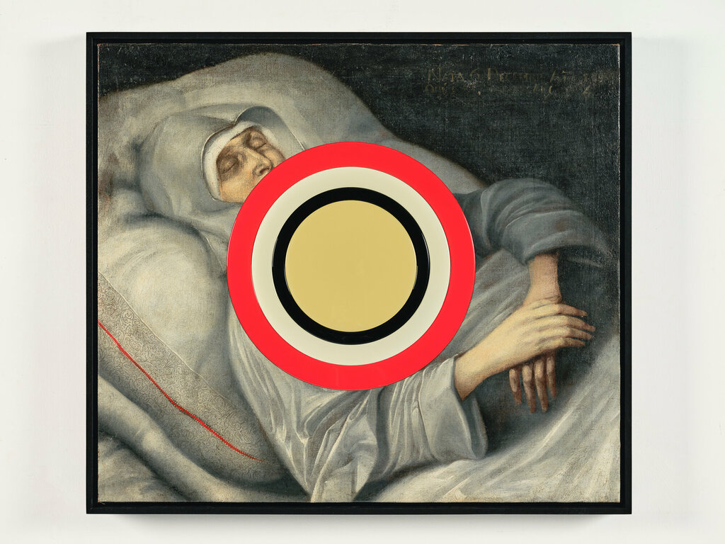 Contemporary inserts into historical painting, 25 1/2 x 25 5/8 in.">