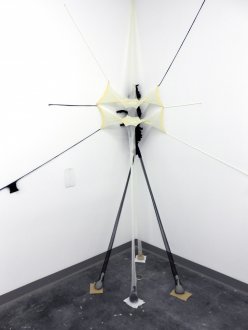 R.S.V.P. Reverie "Bow Leg", 2014. Nylon mesh, found metal and bell, 60 × 8 × 8 in. (collection of The Museum of Fine Arts, Houston, TX).">