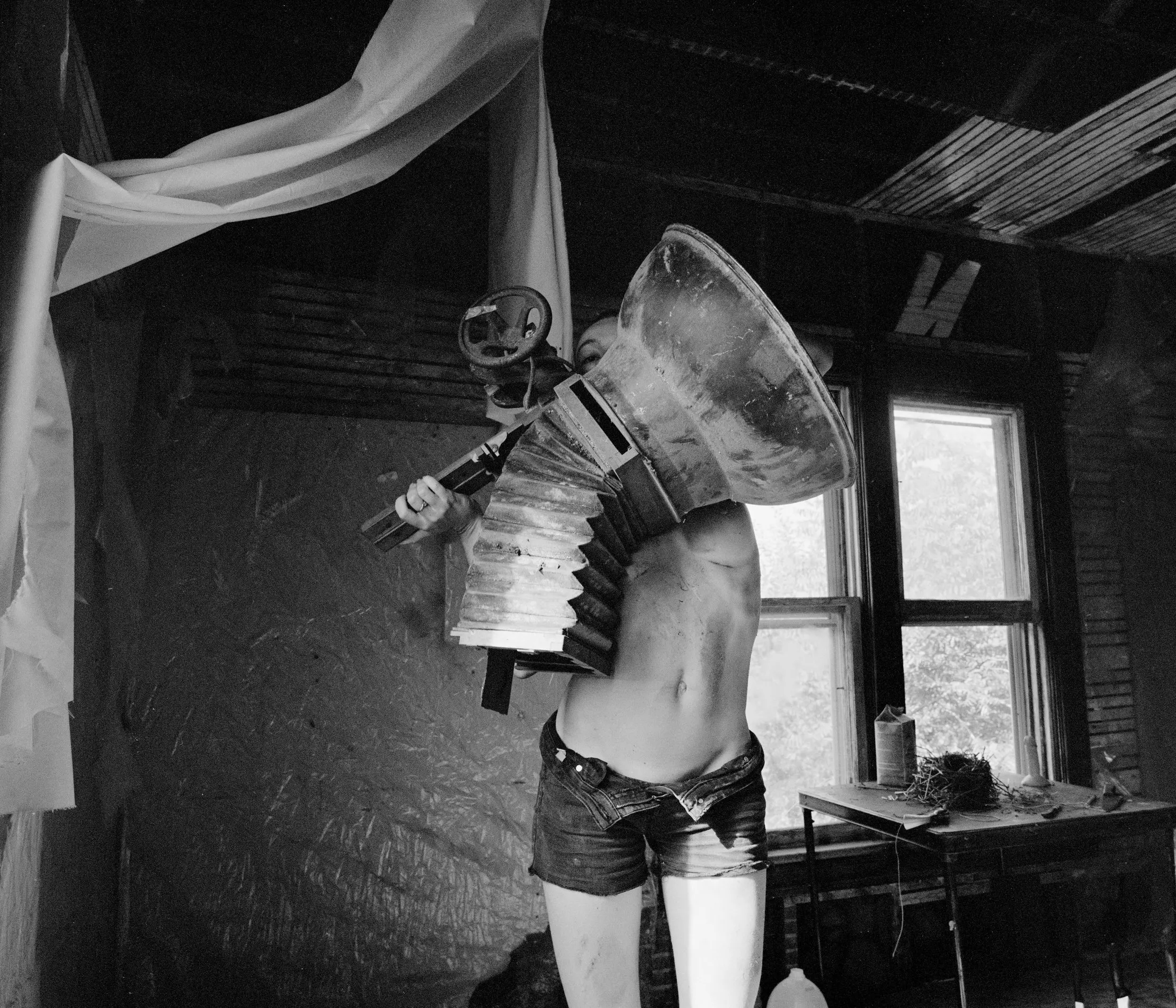 In her self portraits, Olivia Reavey often contrasts her body in an assertive juxtaposition with industrial artifacts whereas in other works, she appears in scenes or performances birthed from moments of spontaneity. In these, friends or models, mostly male and often in the nude, participate in an awkward dance in which neither photographer nor subject knows the choreography. They sway and stomp across a dance floor of intimacy, intimidation, and adoration – renegotiating the complex and murky histories of photographic representation and pre-established power dynamics. Looped into this is Reavey’s photographic fixation with the phallus. Her images capture the nuances of this highly symbolic object – neutralizing any threat with abstraction, humor and her own presence. The results are images that literally and metaphorically pull at the body and relations of intimacies.