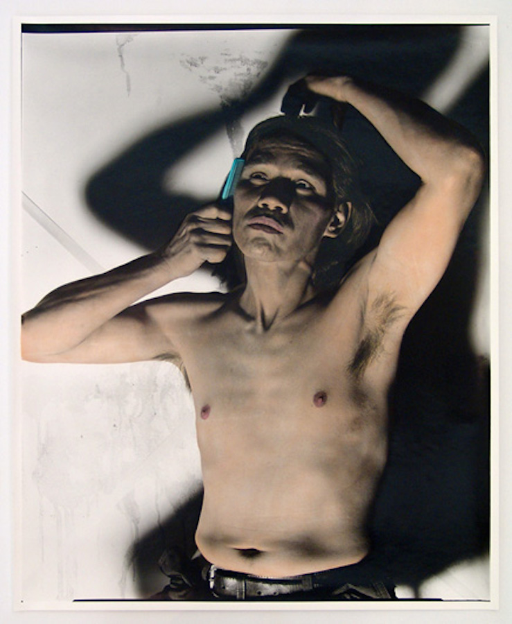 Cherry Blossom portrays a man’s head as the apex of a pile of candy boxes. He is positioned in front of a brown background, with red drips contouring his shadow. Displayed beside is a painting of the same color, which serves as a physical extension of the photograph’s backdrop. In Mikki, a nude woman appears mirrored partly on top of herself; her twinned, transparent bodies seeming to absorb the stained marks on the painting behind her.