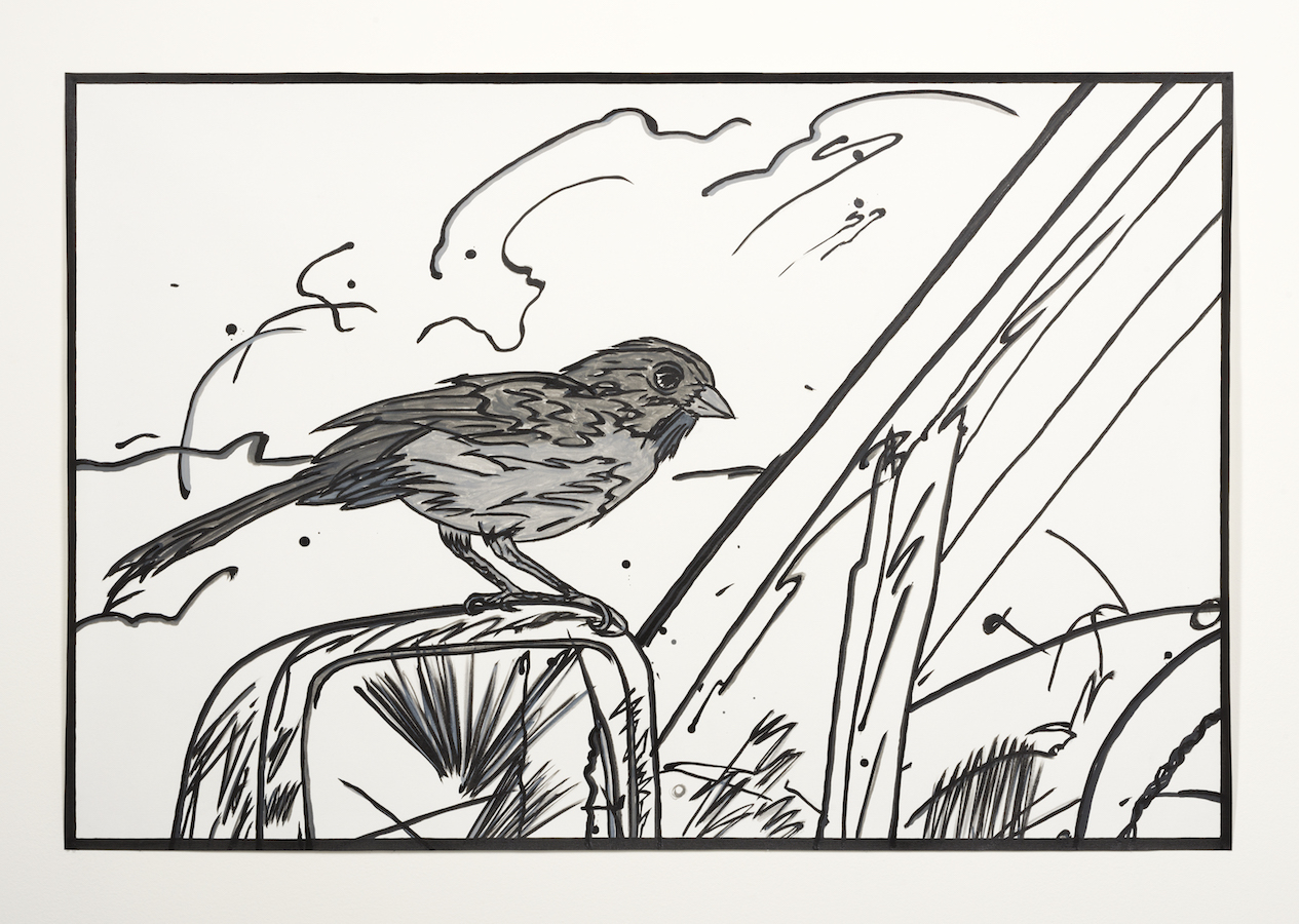 Mark Roeder‘s paintings compile broad categories of images, each image articulated minimally in grayscale. Executed in acrylic and graphite on unstretched polyflex, the works suggest more the aesthetics of drawing than of painting. With their insistent focus on line, Roeder’s images function partly as symbols, pointing towards their origins as well as towards their use. The selected works of the Antipainting series reference variously nature, the landscape, and California itself. Antipainting (Argonauts — Hygh Seas Vesseles Bound for Calyfornya, #1) depicts a scene cluttered with small boats. These ships are populated with caricature-like depictions: in one, a figure with a pipe flies a sign that reads “GOLD INVESTMENT.” In others, rowing figures are paired with those holding shovels. All are headed towards the riches of California.