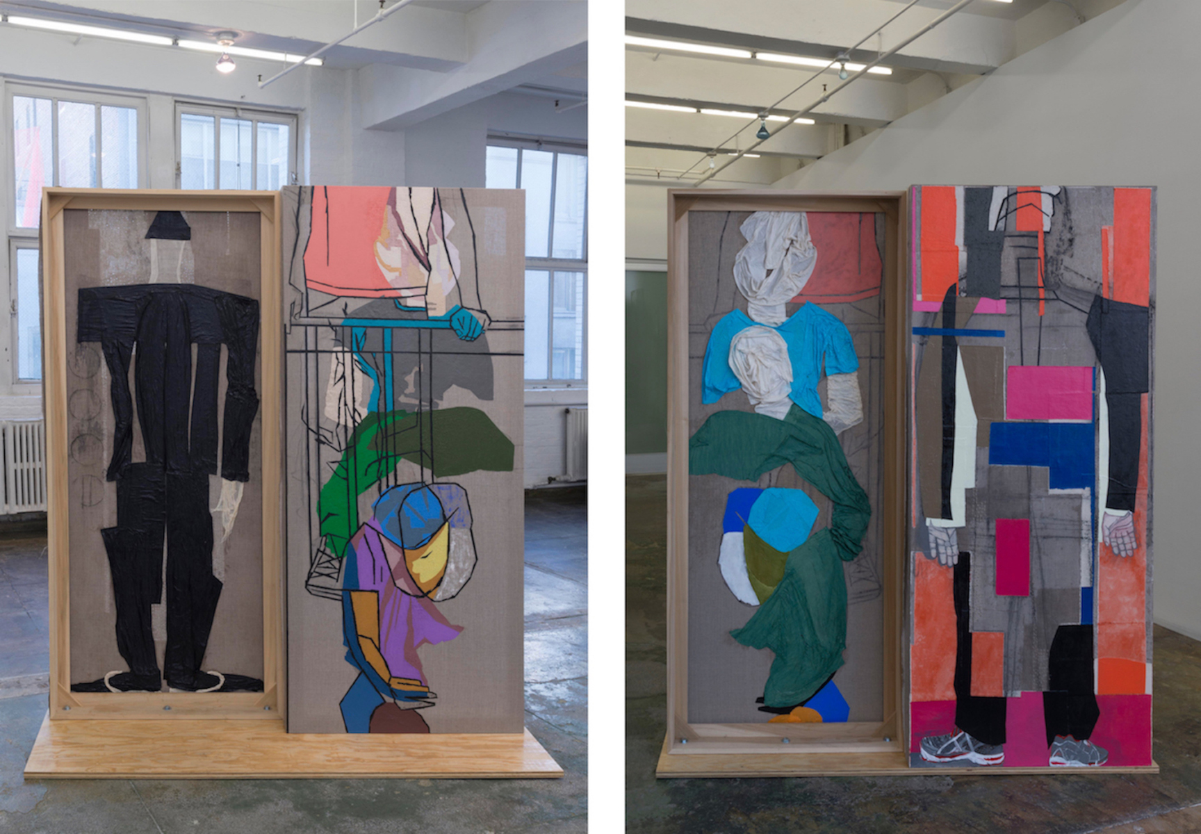 Passengers, 2016. Collage, dyed cheesecloth, muslin, and acrylic mediums on linen panel mounted on plywood base, panel: 81.5 x 36 in, base: 38 x 32 in.">