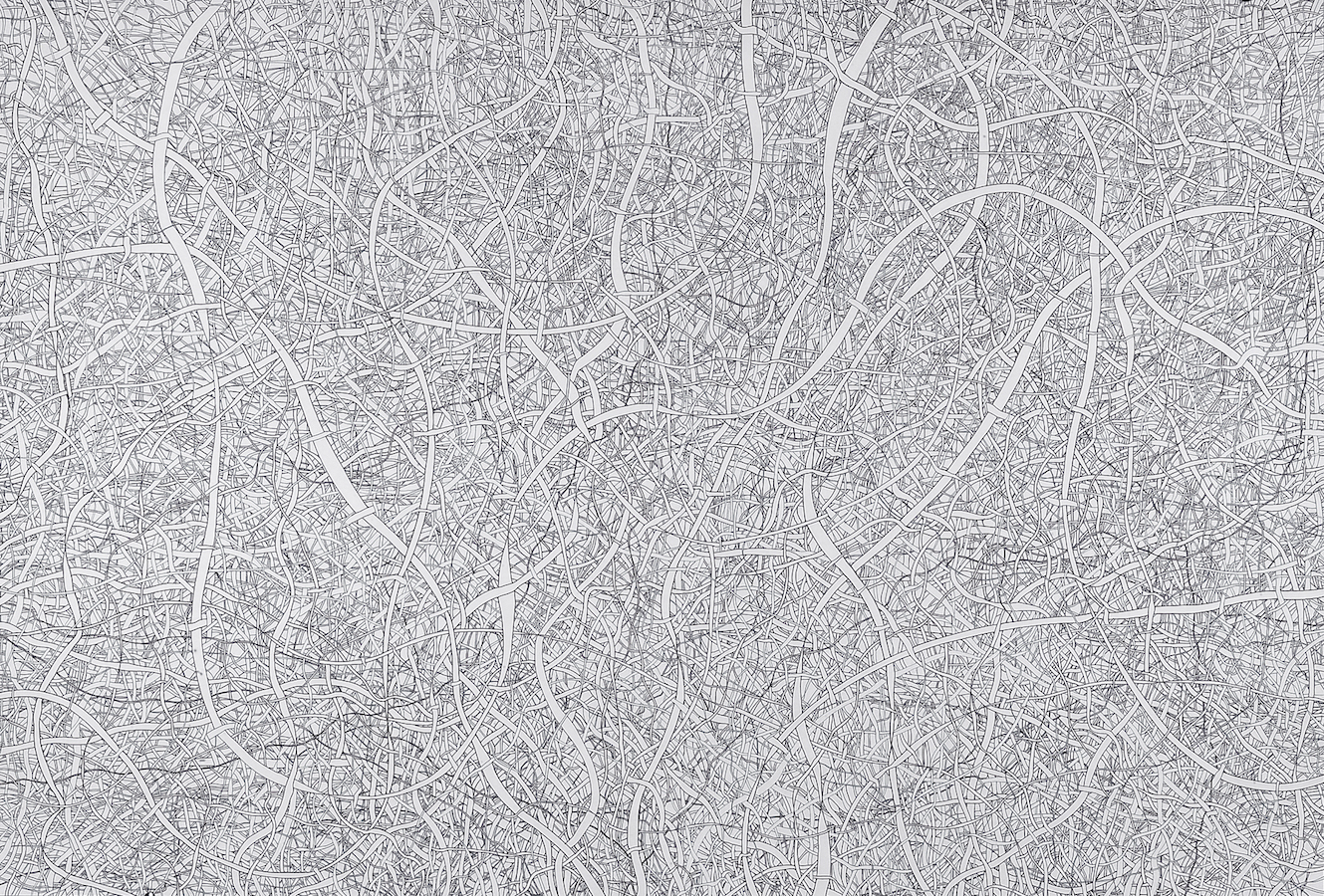 Khawaja executes her black felt-tip pen drawings on often large-scale (up to 8’ x 5’) sheets of paper. Part daily routine, part meditation, her work appears to sublimate interior as well as exterior conditions, growing increments of small details into sometimes full-blown fields, sometimes unifying structures. Drawn by hand with a high degree of precision, her lines take on angular, organic or loopy vectors, shaping into swirls, grids or geometry. It is important for Khawaja to enter into a certain rhythm, leaving behind rationality, and to create a space rather than an image, a vision more than an idea, a human capacity rather than a human story.