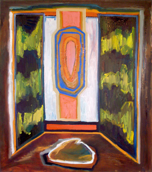 One of the most recently completed works, Transcient Exit, is part of a series that houses abstraction within references to domestic space such as the bath room with its tub, medicine cabinet, faucet and mini blinds. Waddell likens these fixtures to conduits for transcient experiences, which she renders through hyper-saturated color and mobilizing brushwork – placeholders for encompassing mental states.